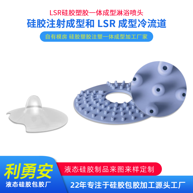 • LSR硅膠塑膠一體成型淋浴噴頭硅膠注射成型和 LSR 成型冷流道  液態硅膠包膠加工 自有模房 硅膠塑膠注塑一體成型加工廠家
