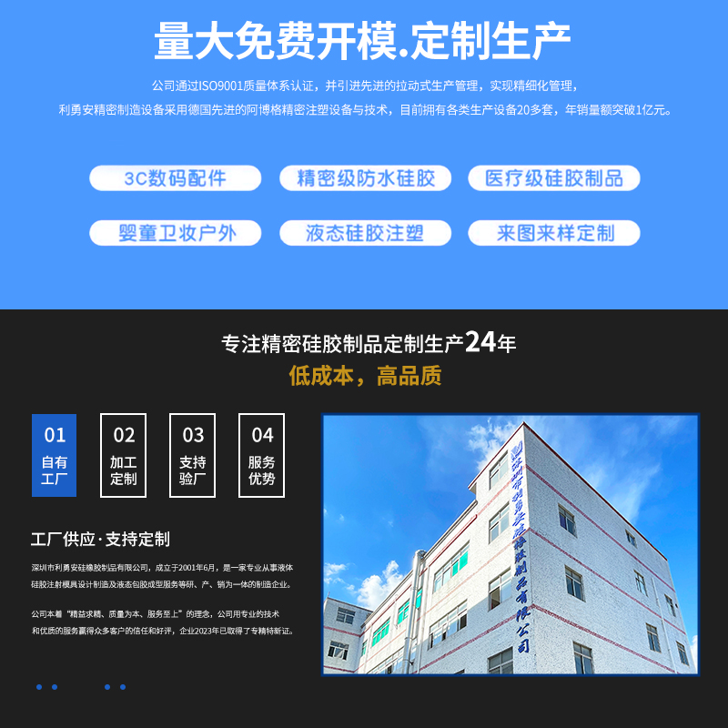 利勇安硅膠始終堅持誠信務實的工作態(tài)度,專注技術創(chuàng)新與品質(zhì)提升 致力于打造高質(zhì)量硅膠產(chǎn)品,持續(xù)深耕汽車、智能穿戴、母嬰用品、3C電子、醫(yī)療行業(yè)與電子霧化等多個領域。專注液態(tài)硅膠制品精密技術研發(fā)24年。
