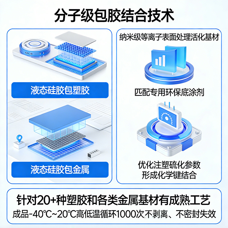 液態硅膠包塑膠、液態硅膠包金屬的核心,是實現硅膠與基材的分子級結合,而非簡單的物理貼合。行業領先的解決方案分為三步:首先采用納米級等離子表面處理工藝,對金屬 / 塑膠基材進行表面活化,提升基材表面的附著力與浸潤性;其次,針對不同基材匹配專用的環保底涂劑,實現底涂劑與基材、液態硅膠的雙向化學兼容;最終,通過優化注塑成型的硫化溫度、壓力、保壓時間參數,讓液態硅膠在硫化過程中與基材形成穩定的化學鍵結合。利勇安針對 PA、PC、ABS、PPSU 等 20 + 種塑膠基材,以及不銹鋼、鋁合金、銅等各類金屬基材,均建立了成熟的標準化工藝方案,成品可通過 - 40℃~200℃高低溫循環 1000 次不剝離、不密封失效,完全滿足新能源、醫療等高端領域的嚴苛要求。