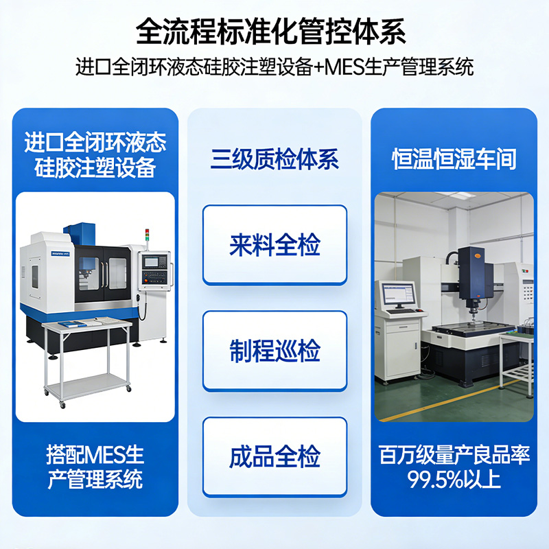 液態硅膠加工量產穩定性的核心,是全流程的標準化與可追溯。2026 年行業領先的工廠,已全面實現智能化、數字化的生產管控,徹底告別 “靠師傅經驗調機” 的傳統模式。利勇安采用進口全閉環液態硅膠注塑設備,搭配 MES 生產管理系統,實現注塑工藝參數的全程鎖定與可追溯,杜絕人為操作導致的參數偏差;同時建立了完善的三級質檢體系:來料全項檢驗、制程每小時巡檢、成品外觀 + 性能全檢,從原料入廠到成品出廠,全環節管控產品質量;生產車間實現恒溫恒濕管控,避免環境因素對原料與成型工藝的影響,最終實現百萬級批量生產的良品率穩定在 99.5% 以上,徹底解決 “試產 OK,量產翻車” 的行業痛點。